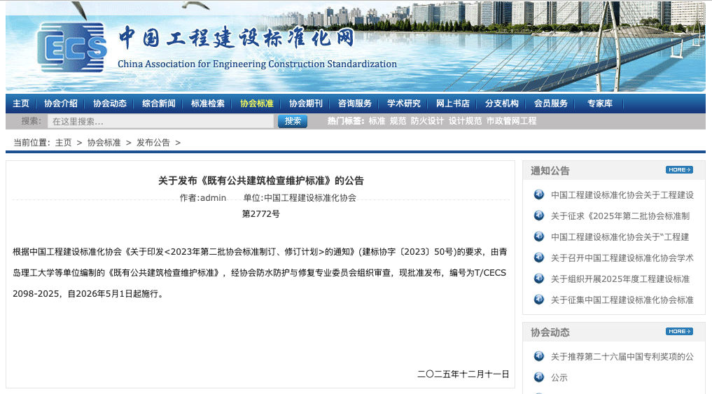 2025年12月11日,中国工程建设标准化协会(CECS)正式批准发布了两项关键行业标准——《既有公共建筑检查维护标准》(T/CECS 2098-2025)与《既有居住建筑检查维护标准》(T/CECS 2097-2025)。该两项标准的制定是基于协会《2023年第二批协会标准制订、修订计划》(建标协字〔2023〕50号)的要求,由青岛理工大学等单位牵头编制,青岛中邦科技新材料有限公司作为参编单位之一,为标准的制定贡献了专业力量。